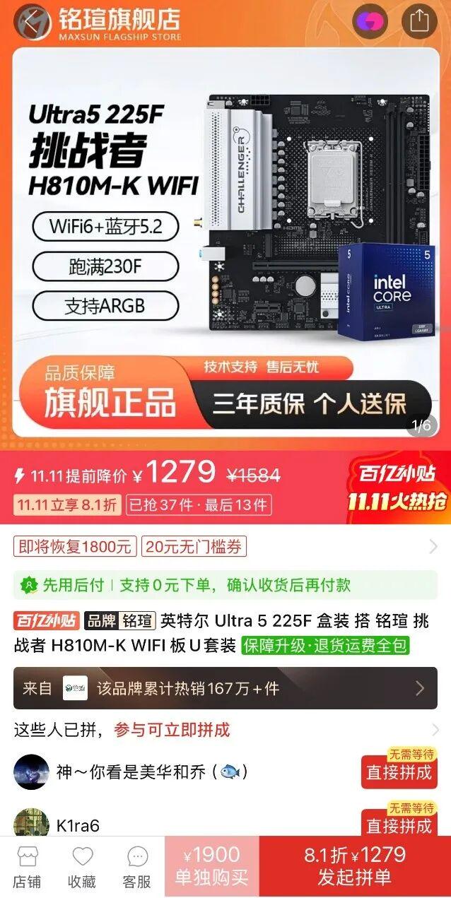 处理器可以降级到Ultra 5-225F,并且主板可以搭配铭瑄的挑战者H810M-K Wi-Fi这类板子,相关的CPU套装可以去PDD上找,理论上价格可以控制到1300元附近(PDD显示为1279元,选择Wi-Fi版就是为了无线网卡附带的蓝牙功能),并且CPU散热器就不需要单独购买了,直接用盒装CPU自带的原装散热器就足够,缺点是它不是白色。此处预算相比前面那一套可以-560+。